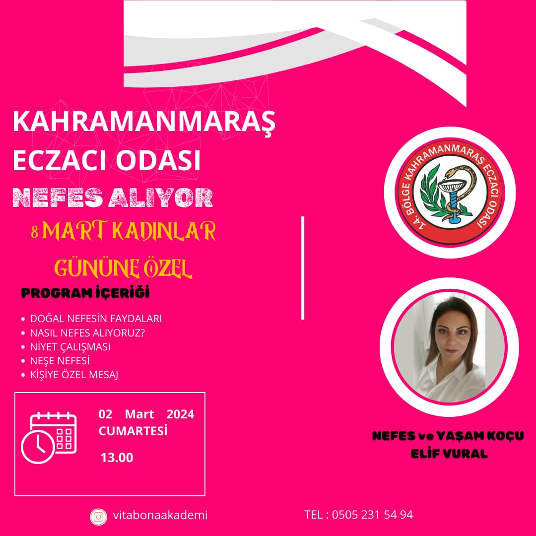 8 Mart Dünya Kadınlar Günü kapsamında bayan meslektaşlarımıza yönelik 02.03.2024 Cumartesi günü saat 13:00'da oda binamızda Nefes Ve Yaşam koçu Elif Vural'ın katılacağı "Kahramanmaraş Eczacı Odası Nefes Alıyor" konulu sunum ve çay programı düzenlenecektir. Tüm bayan meslektaşlarımızın bilgisine sunulur.